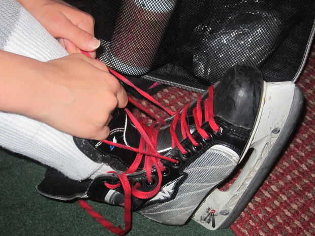 Una vez que tengas los pantalones de hockey, luego sentarse y el hockey sobre patines en.