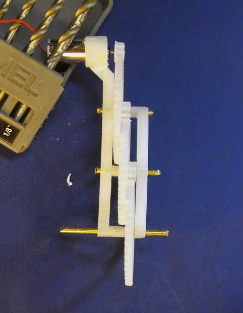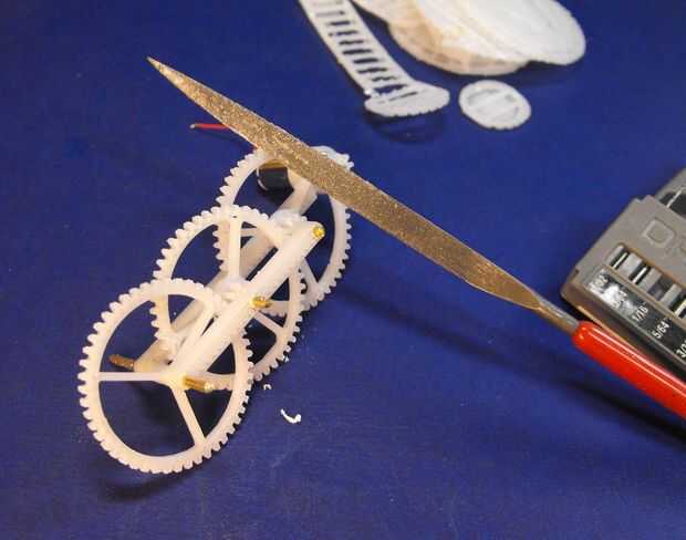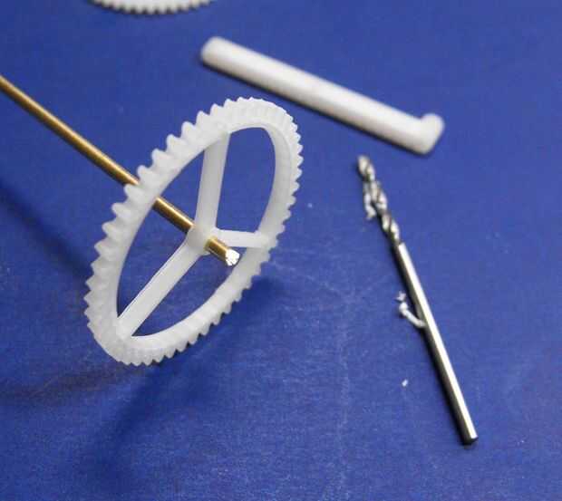 - Para hacer un engranaje girar libremente alrededor de la varilla de latón, utilice la broca como un archivo y una resma del centro del engranaje hasta que gira. Lo mismo va para los agujeros en el marco que deben permitir que la varilla gire.