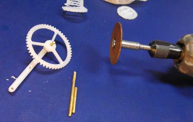 - Desmontar la caja de engranajes y usar una herramienta dremel para tamaño y pulir los extremos de las barras de latón.