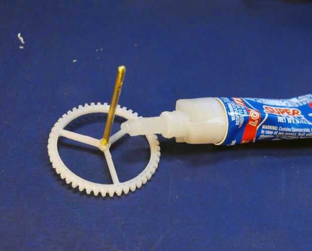 - Pegamento estupendo de las barras de latón en el bastidor y los engranajes donde sea necesario. No pegue los engranajes a uno con el otro o el marco! Ser realmente super cuidado de no conseguir pegamento donde no quieres, no hay vuelta atrás después de este punto! \