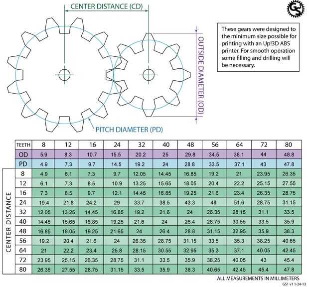 Es compatible con la tabla por encima de las listas de las distancias de centro para todos los pares de engranajes que se pueden hacer con el juego, por hacer referencia a este cuadro usted puede conectar fácilmente los engranajes entre sí y diseño. Hay una versión en PDF de estos gráficos que adjunto a esta página.