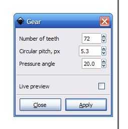 - Se abrirá la caja de opción. Establecer el número de dientes que quiere, el tono circuilar 5,3 píxeles y el ángulo de presión a 20 grados. Estos ajustes determinan la distancia entre los dientes (Circuilar Pitch) y la agudeza de los dientes de engranaje (ángulo de presión). He elegido los valores dados a grandes los dientes más pequeño podía imprimir sin dejar de ser funcional.