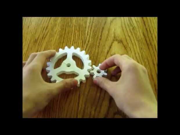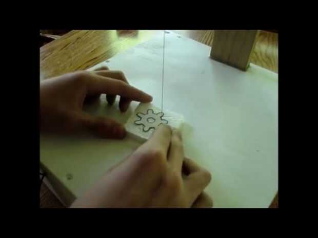 Después de que el pegamento se seca, fui y cortar los engranajes con mi cortador de espuma casero Hot-wire (Instructable muy pronto!). Asegúrese de seguir las líneas tan cerca como sea posible, los engranajes encajan.