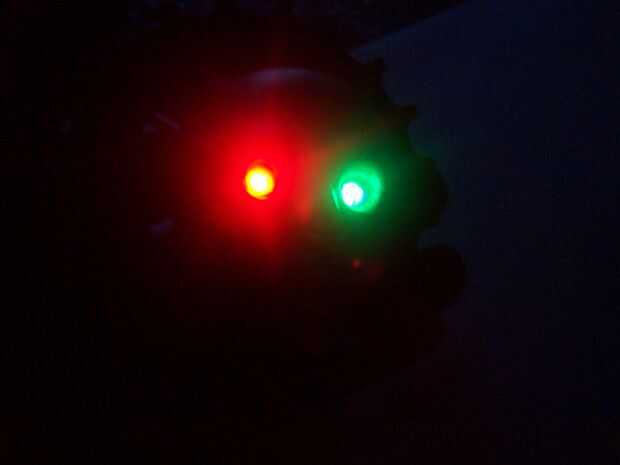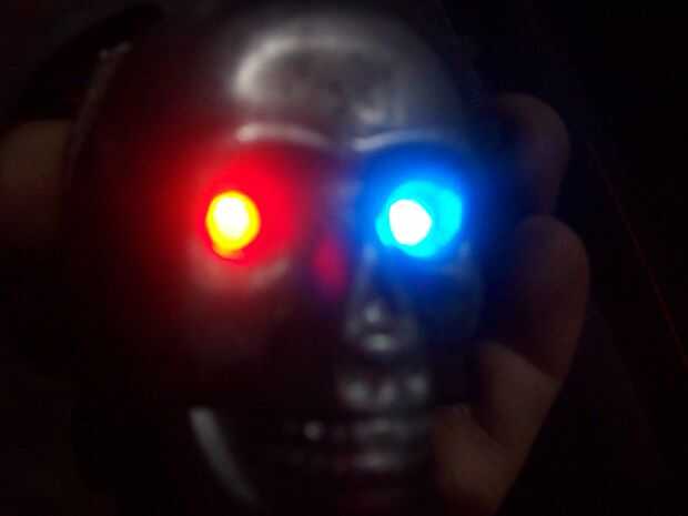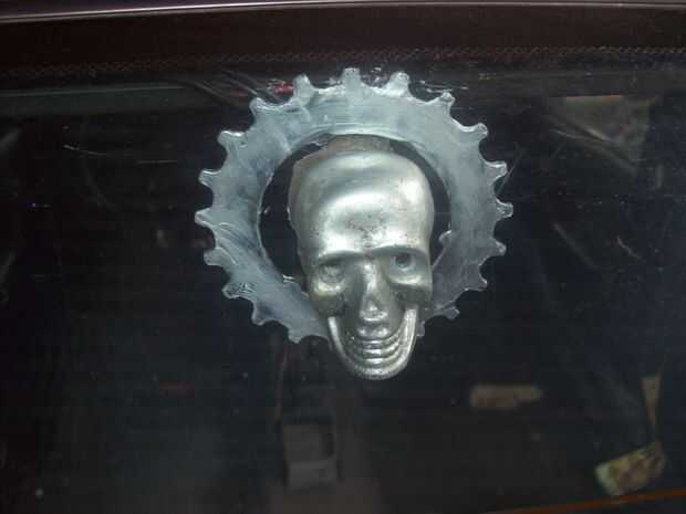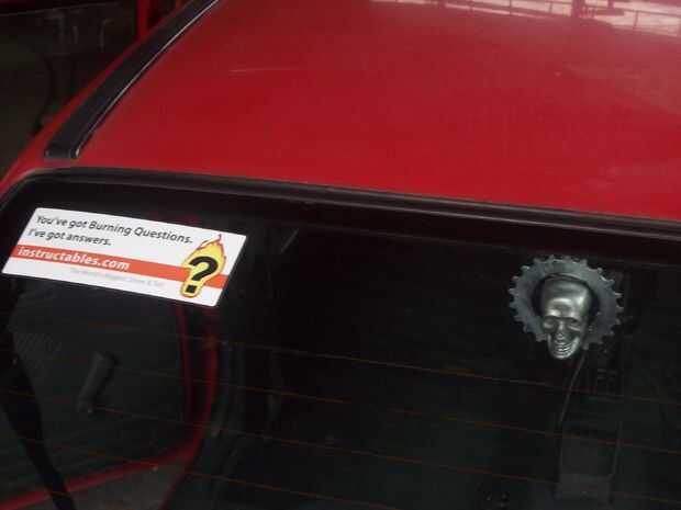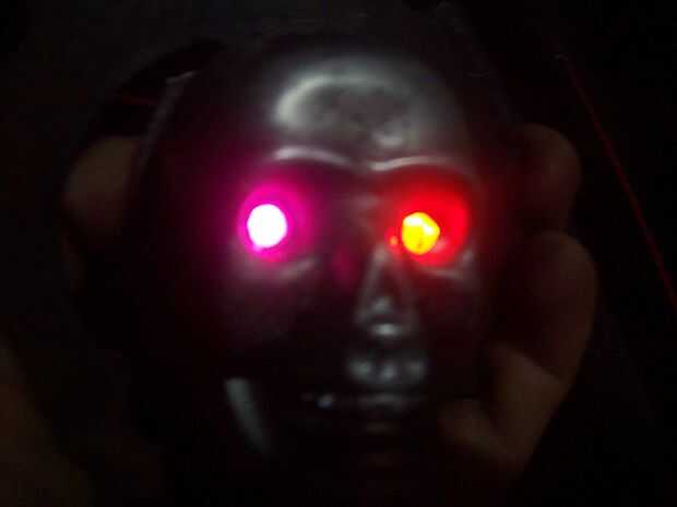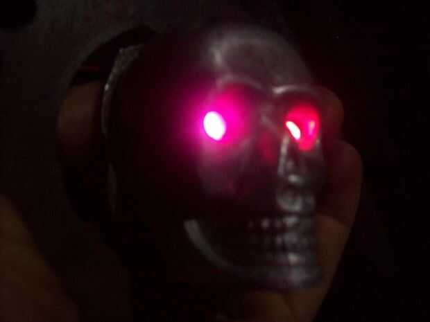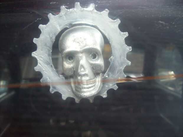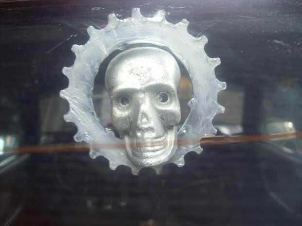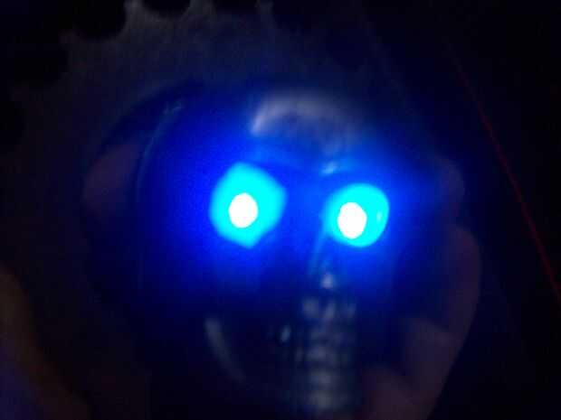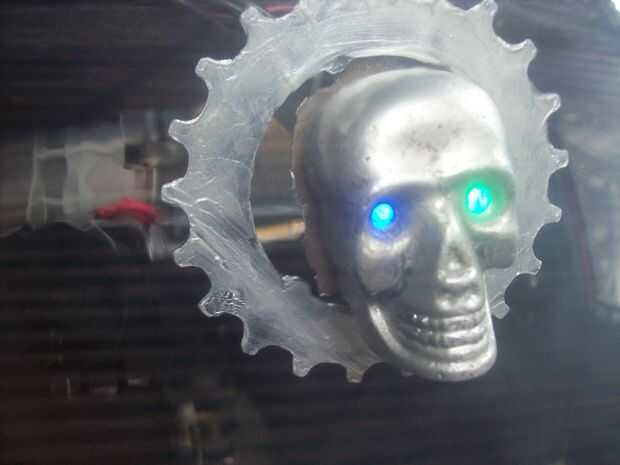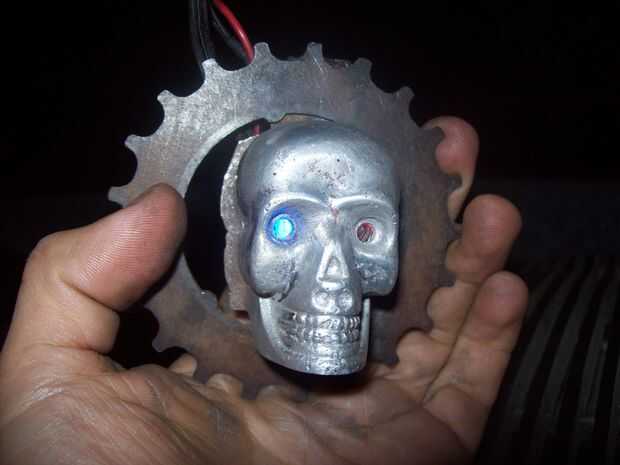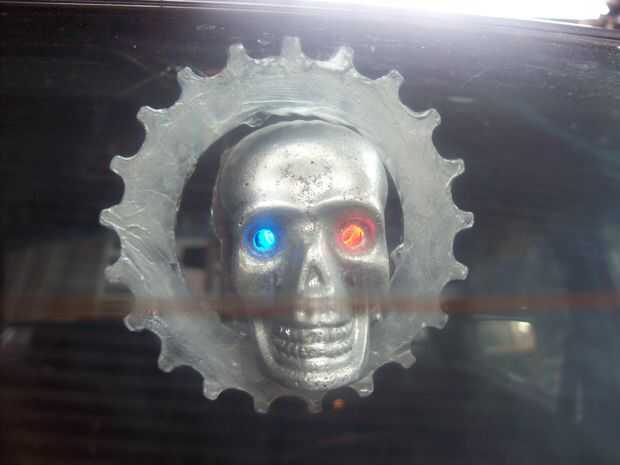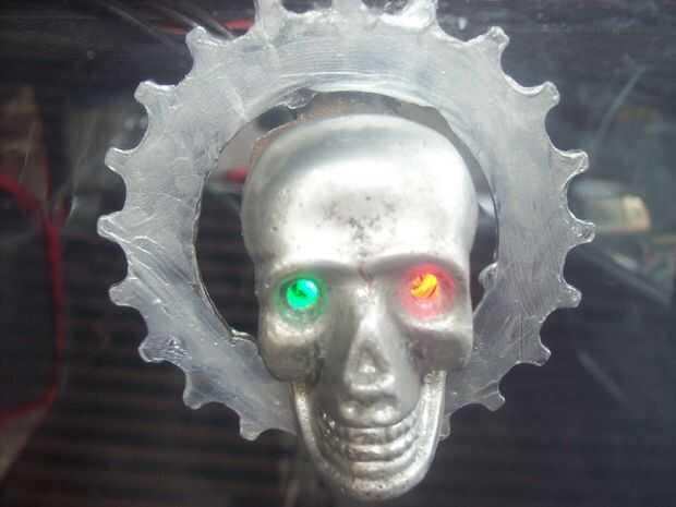 Sólo necesitaba un cráneo antiguo de un manillar de bicicleta antigua, un engranaje, dos leds de lasers baratos, algunos cables y pintura.