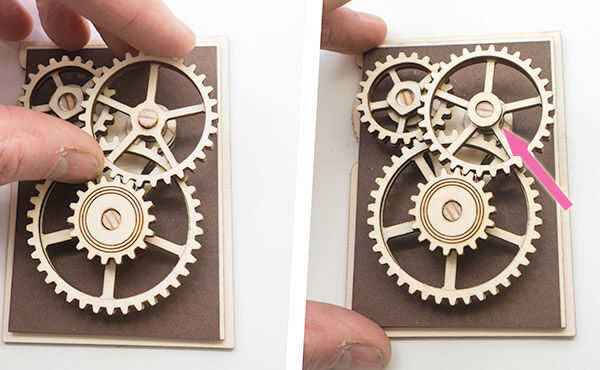 Colocar el engranaje final sobre la espiga restantes. Montar el anillo restante sobre él para que sostiene el engranaje pero todavía permite que gire.