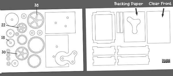 El archivo de piezas está dividido en dos páginas. El archivo es un pdf. Como cortadoras láser diferentes utilizan diferentes formatos de archivo lo dejo a usted para convertirlo a un formato adecuado para su máquina.