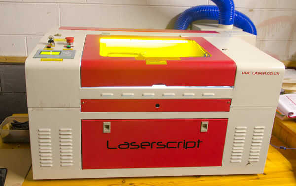 La segunda imagen muestra el HPCLaser en acción cortando las piezas.
