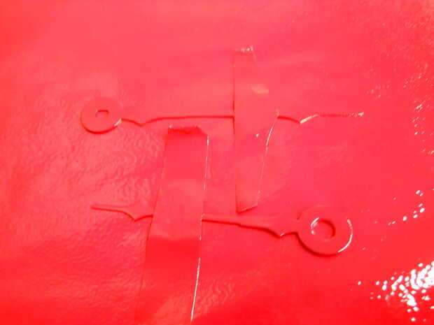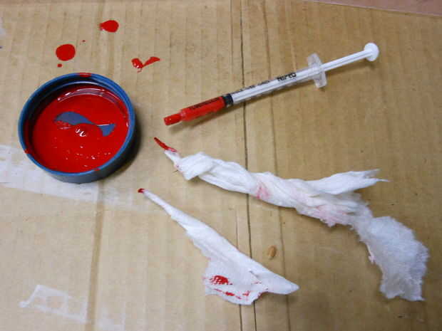 Primer intento de pinta de rojo los hoyuelos de alineación: vino la jeringa sin aguja (así que fue descuidado), porque era para medicar a nuestras gallinas y pollos no como agujas; son... pollo. (Nunca sabes cuando tus gallinas vendrá abajo con viruela humana). Torcido encima de toallas de papel trabajados mejor para trabajo de detalle.