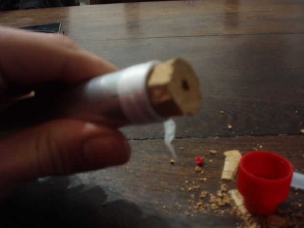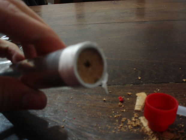 Hacer un agujero de 5mm en el corcho y el polper tapa e introducir el corcho en el tubo de aluminio.
