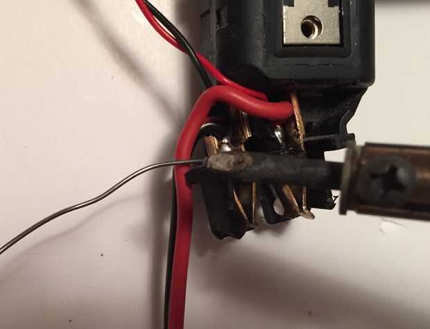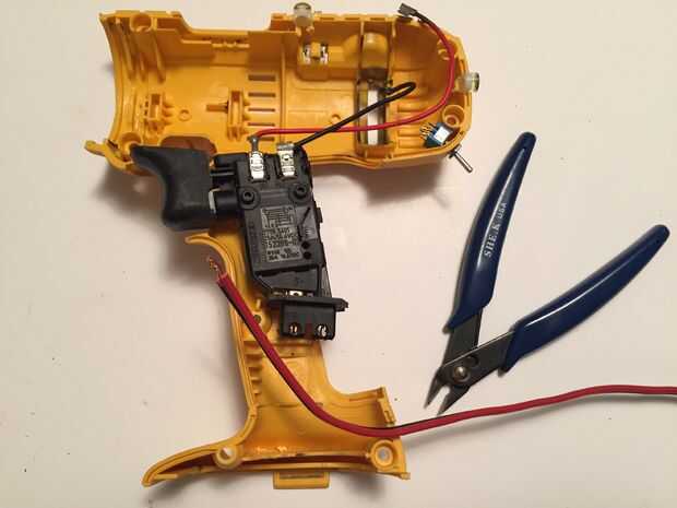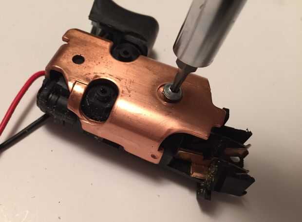 Brevemente considera conectar en la parte superior del interruptor pero se dio cuenta que en uso, podría invertirse la polaridad y la tensión por el control de la broca.