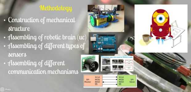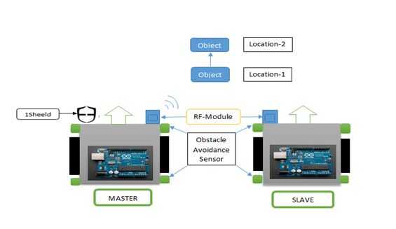 A) Arduino maestro y esclavo: el maestro y el esclavo son dos arduino basado en robots, que cooperan juntos para llevar a cabo la tarea deseada-en nuestro caso transporte de objetos pesados. El maestro controla el movimiento y acciones del esclavo a través del módulo de RF que se explica en la siguiente parte.