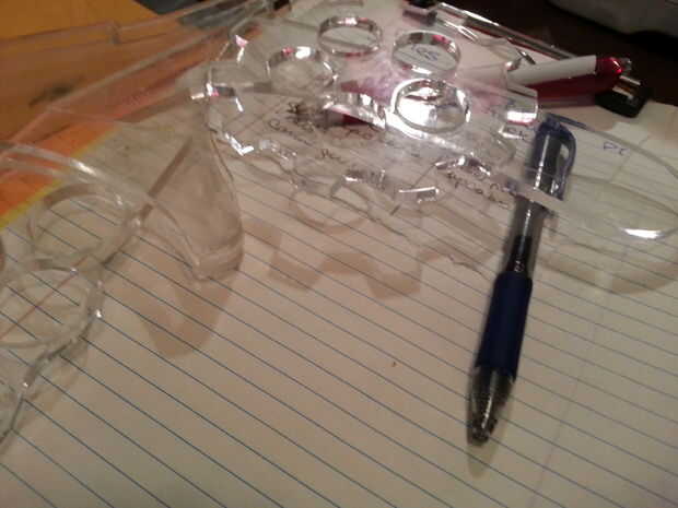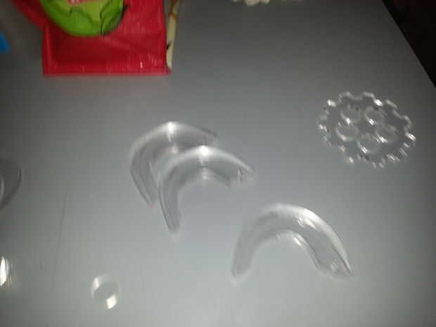 Las piezas encajan muy bien. Ahora el brazo principal (que contiene el gancho al cuerpo) si se han conectado a la manija, no me di cuenta esto hasta mediado construir. He utilizado los círculos de los agujeros del dedo y los orificios engranaje como espaciadores para el disco que contiene los ganchos (para evitar golpear el cuerpo) los agujeros a un pulgada de diámetro. También he añadido un soporte para los espaciadores que no en la plantilla y un pequeño pedazo para apoyar el pedazo del cuerpo por el mango no es necesario pero ayuda