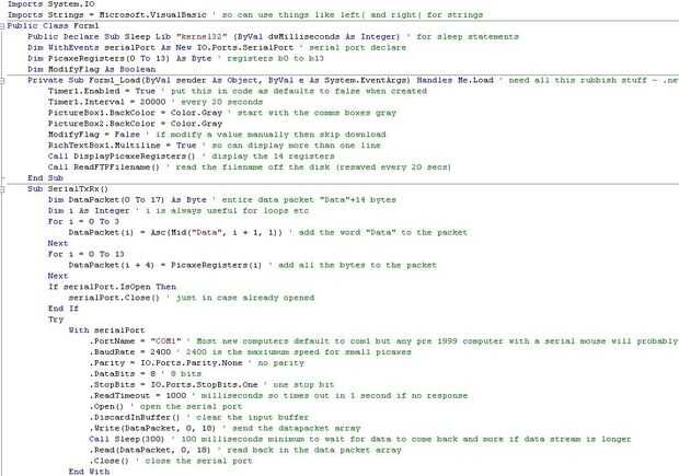 Por la petición, aquí son una serie de imágenes del código de vb.net con el formato en el lugar. Este código fue copiado realmente detrás de este instructivo y el formato volvió a aparecer automáticamente. Sería mejor copiar y pegar el texto que intentar leer estos cuadros, pero estos será útiles si usted está en un café internet y no puede instalar vb.net.