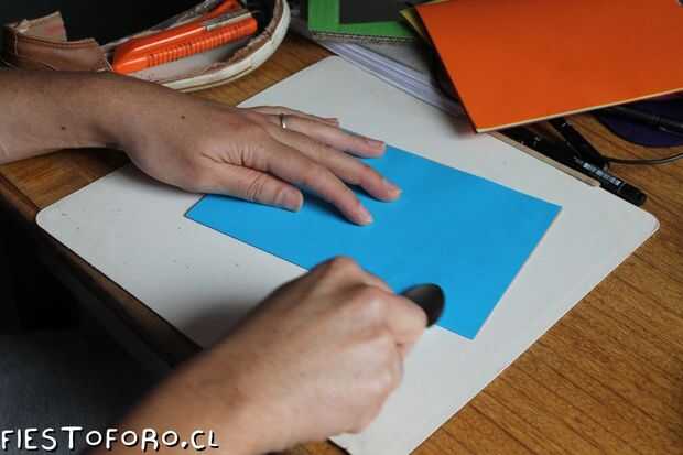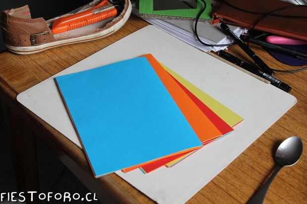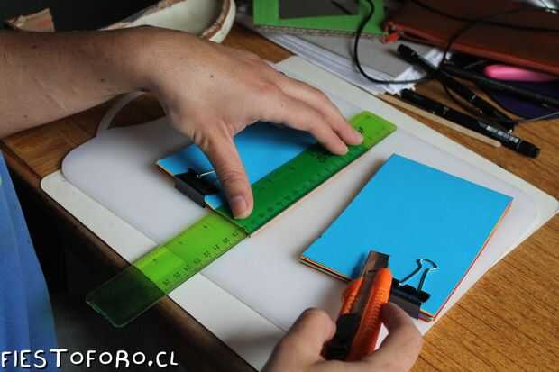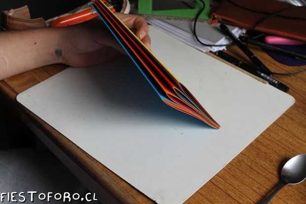 Recoger colores hojas de papel (tamaño A4) y doblar una vez. Cuando se pulsa, utilizar un objeto romo, por ejemplo, un tenedor, para obtener bordes plegados aseados. Yo he doblado 4 series o secciones de hojas A4 (cada juego tiene 4 hojas plegadas). Cuando han doblado todos los conjuntos, cortados por la mitad con un cuchillo. El cuaderno de dibujo final será aproximadamente 10 cm x 14 cm (casi A6 tamaño, 4 × 6 pulg), después de recortar los bordes.