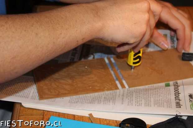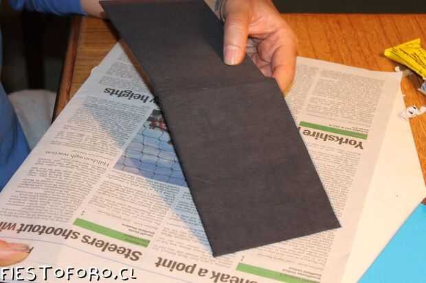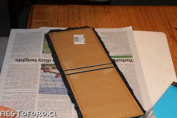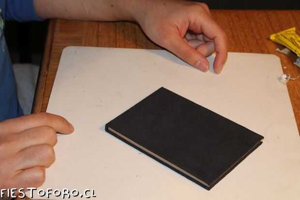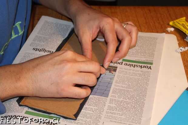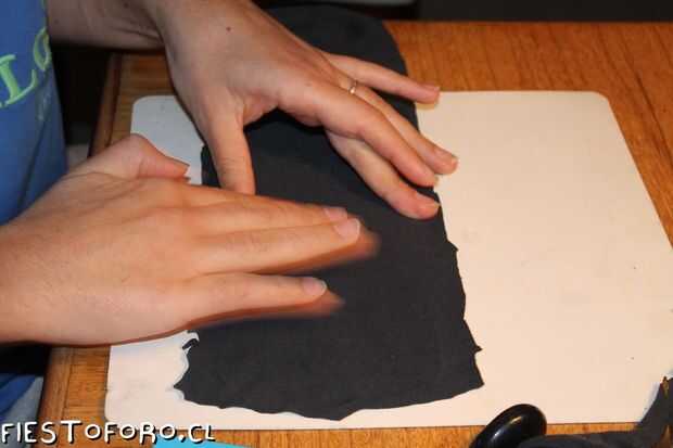 El forro o la cubierta está hecha de algodón (una camiseta vieja). Cortar una pieza que se extiende alrededor de 1cm (.4in) fuera de las piezas de cartón y pegamento. Una vez que se pega, girar y aplique el pegamento a los bordes y doblar la tela.
