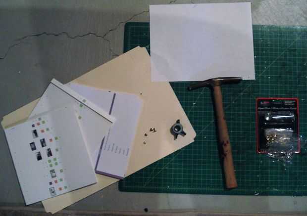 1. una perforadora. Este no es el tipo de los utilizados en la escuela primaria. Usted puede encontrar una perforadora para trabajo en la mayoría de tiendas de artesanía. Debe tener un golpe al tamaño exacto del remache que va a utilizar. Esperamos que podrás encontrar el tipo de palo. Sólo pude encontrar un rotativo que arrancaron la cabeza rotatoria de. Esto no era divertido y no para la gente tiene Mieda de ser apuñalado por los pedacitos del metal.