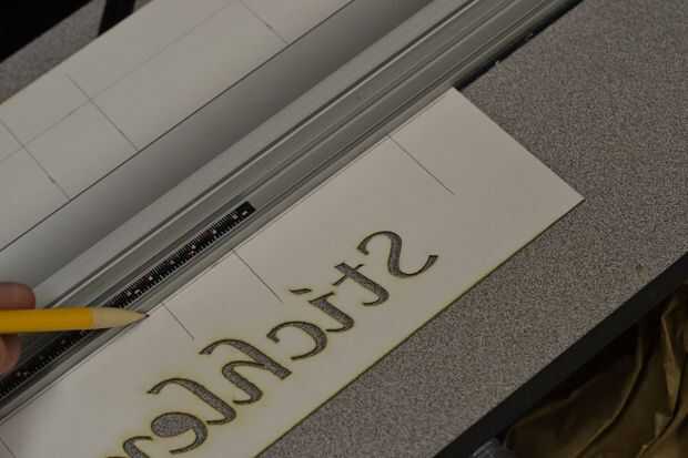 Medida en la parte posterior de la lámina perimétrica, pequeñas marcas indican los bordes de las imágenes. Esto se coloca en el cortador de lámina perimétrica y las marcas que se extendió más allá de los extremos cerca de 1 pulgada.