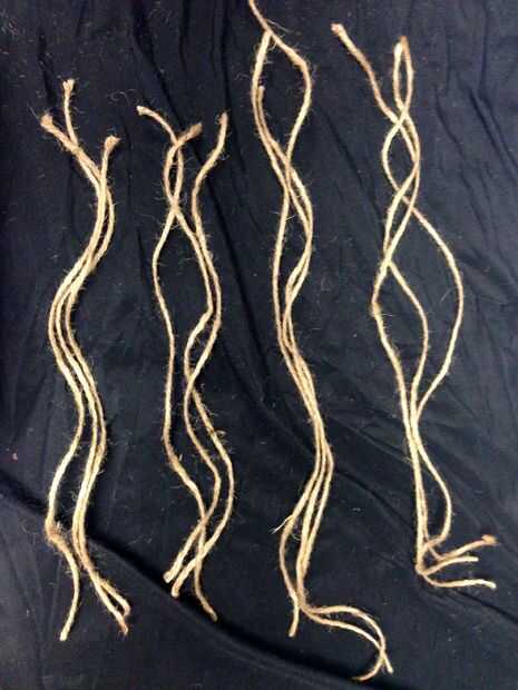 En primer lugar, saque la guita del embalaje. Medir tres piezas para cada lado de su arte, cada pieza un par de pulgadas más largos que el lado que esté cortando para. No es necesario ser de una longitud exacta, pero es mejor tener una pieza más larga que una pieza más corta cuando se produce la trenza terminada de guita. Tiene doce cuerdas individuales de cuerda agrupadas en conjuntos de tres.