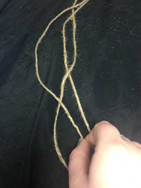 A continuación, se trenza el hilo. Cada grupo de tres se trenzó para completar un lado del marco. Para trenza, colocar las tres cuerdas con poco espacio que los separa. Si no está familiarizado con un trenzado clásico, emplean los siguientes pasos.