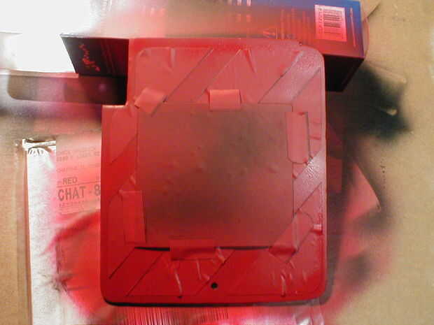 Con el masking de hecho, todo lo que quedaba, era aplicar la pintura roja.  Para mantener líneas de sharp, es una buena idea para quitar la máscara antes de que la pintura se seca.  Si seca antes de retirar la máscara, usando un cuchillo x-acto, corte alrededor del borde de la mascarilla a la pintura.  Esto evitará que la pintura peeling cuando retire la cinta.