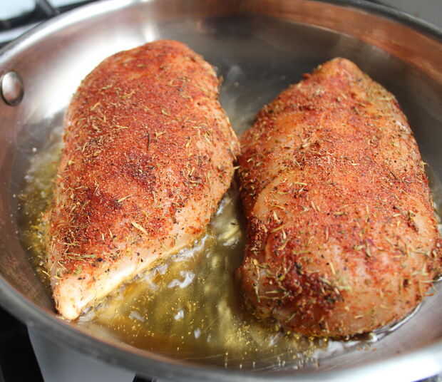 - Una vez que el aceite es agradable y caliente y trémulos, en tus pechugas de pollo. No la muchedumbre les o no conseguir ennegrecidos!