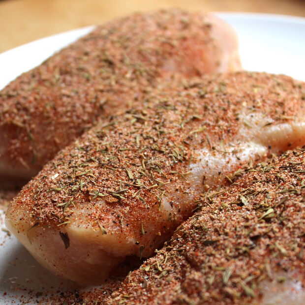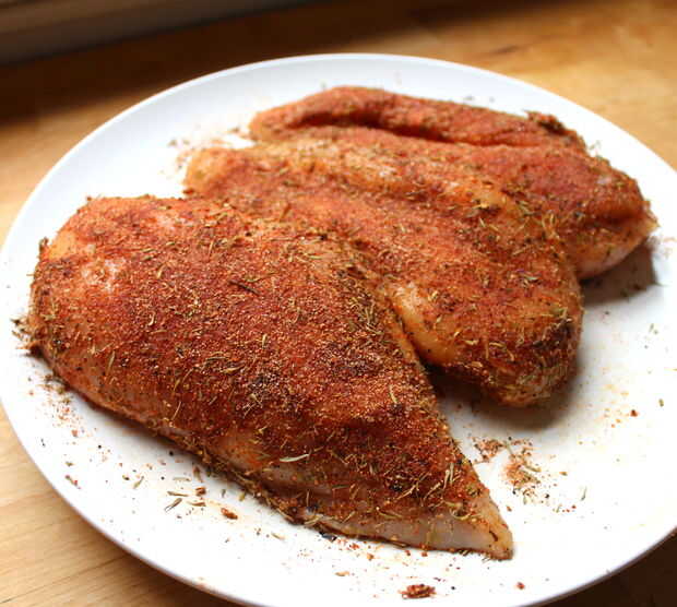 - Capa de pechugas de pollo en el sazonador ennegrecido - se puede ver en las fotos cuánto debe ir de. Deben ser agradables y naranja!