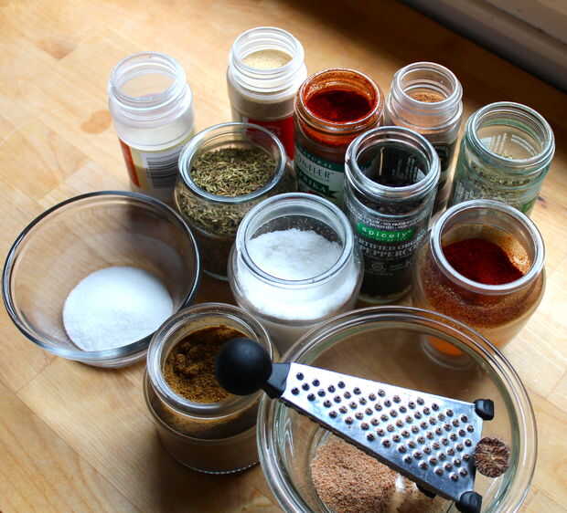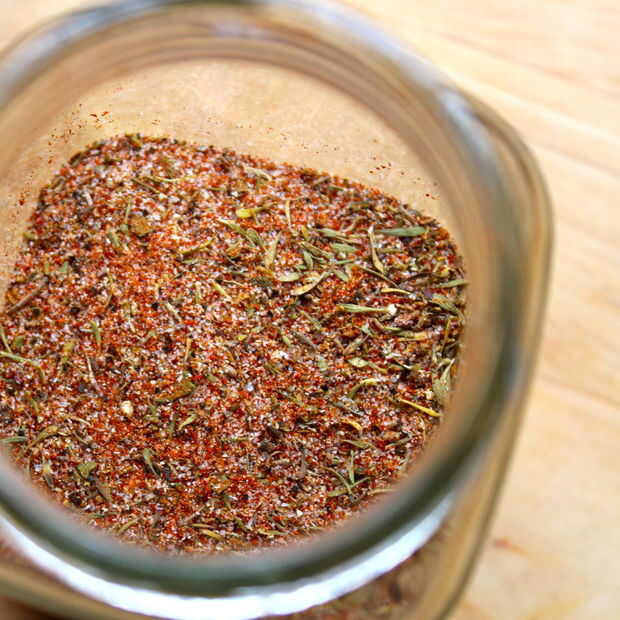 Combinar todo esto en un contenedor puede almacenar los condimentos en - un recipiente pequeño tupperware o un tarro de cristal pequeño. Estoy usando un frasco de mermelada. Entonces simplemente agite hasta combinar bien. Ennegrecido condimento lo suficiente para unos usos - cubrió tres enormes pechugas de pollo y tenía un montón de izquierda.