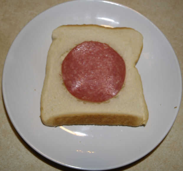 1. este paso es bastante simple, coloque su salami en un pedazo de pan y cortar alrededor de ella, darse un pequeño círculo de pan.