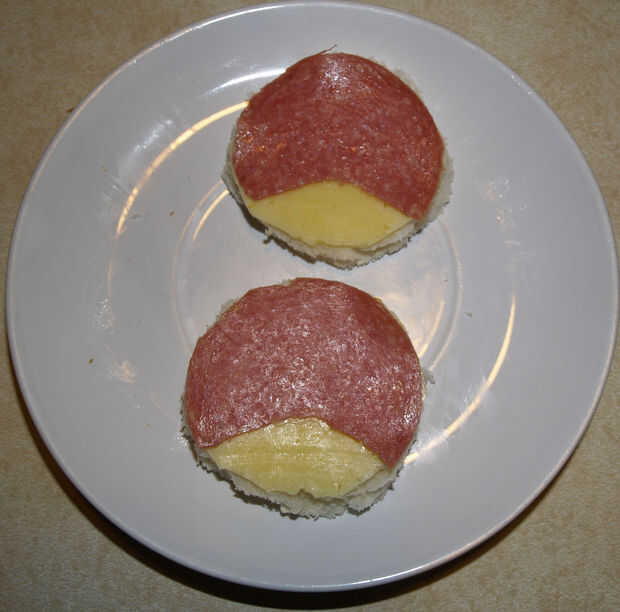 2. cortar el queso para caber el Salame y pan. Te recomiendo quitar la brea y corte el queso alrededor de sólo el salami. El pan, queso y salami de capa como se muestra.