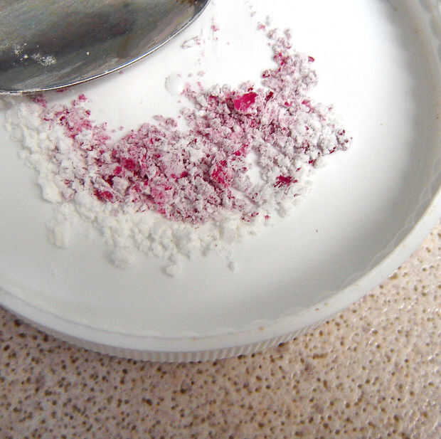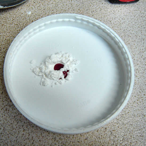 - Añadir una o dos gotas de colorante de comida rojo y mezclar con una cuchara