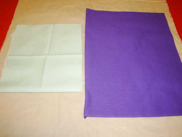 1 pedazo de tela de algodón (púrpura) corte 8 "X 11" Coloque el doblez con el lado corto en el pliegue. Esto se convertirá en la parte superior del bolsillo de.
