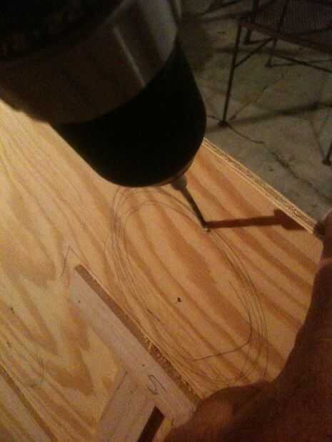 A continuación, en la parte superior del círculo del globo, hacer un agujero de taladro diagonal para que puedan tener un segundo tornillo para sujetar el balón de. (usted puede hacer esto con alfileres de ropa, etc, si quieres). Con los agujeros de la diagonal, el tornillo en de la parte posterior por lo que se trata, un poco más que los otros tornillos y tiene un ángulo que. (Puede que tenga tornillos más largos debido al ángulo).