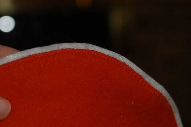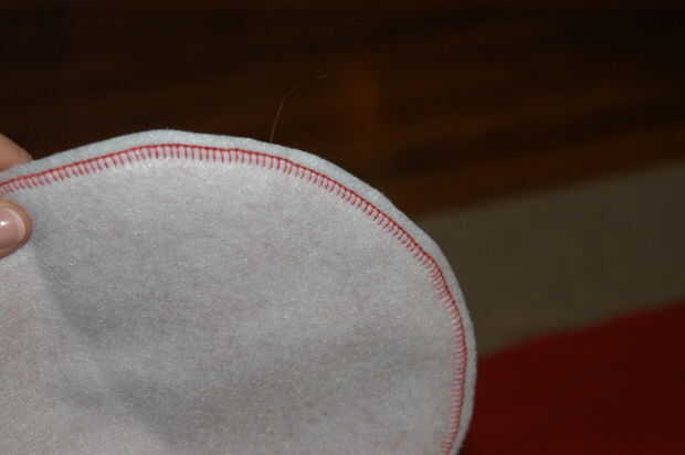 * Si estás haciendo tu Angry Bird rojo de paño grueso y suave que también es rojo, entonces te recomiendo que recortar un círculo adicional en blanco (forro polar o fieltro está muy bien) - y el círculo blanco sobre un 1/2 pulgada más grande que el rojo. Luego trace y recorte su principal rojo del círculo de fieltro o paño grueso y suave. La razón por la que hizo esto es mostrar un contraste en los colores - y la manta se ve más bonita así. Luego coser el círculo rojo sobre el blanco one.*