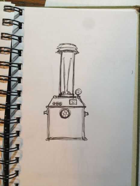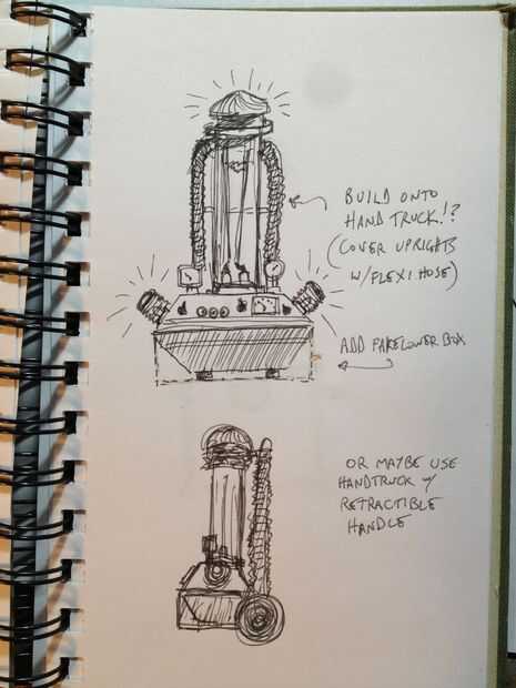 Para la base, mi primer plan era utilizar una caja de la ventana que había encontrado en Orchard Supply Hardware, que (si se usa al revés) tenía una bonita silueta trapezoidal. Pensé que lo mejor sería usar dos, uno al revés y una derecha arriba. Por lo es lo que dibujé primero, junto con la idea de incorporar una carretilla de mano (dolly) en el diseño así que se podría mover fácilmente.