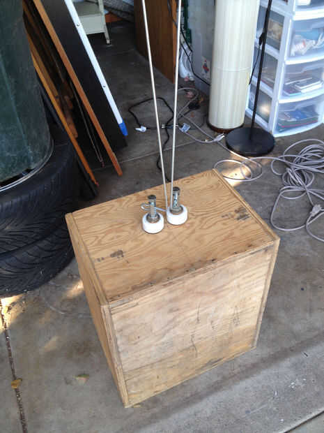 Para esta prueba, hice un rápido cableado del cable de alimentación y bornes de tierra del transformador. También, usando el cable de alto voltaje, conectados los aisladores de salida en la parte inferior de los aisladores de mis electrodos.