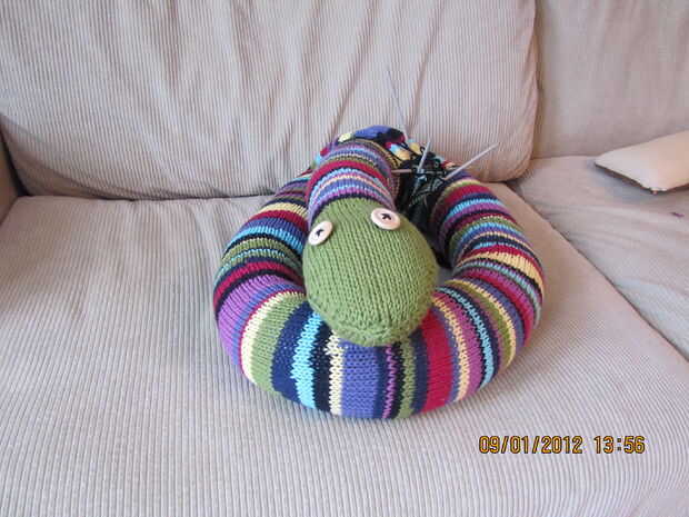 esta serpiente stripey proviene de un patrón en el libro de Zoe Mellor, juguetes de punto. Utilicé un hilo que mi tía compró en una venta de garage, así como unos nuevos madejas para añadir color. A este punto otra vez utilizaría hilo más fino. Que s