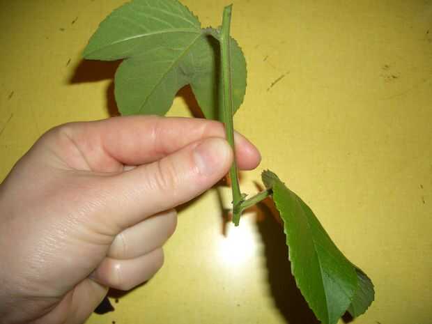 Es decir, utilizar un segmento entre dos nodos de hoja. Eliminar la hoja inferior y tratar el nodo inferior y la hoja de la misma como su primer corte. Inmersión en enraizamiento hormonal y planta en el medio del encapsulamiento.