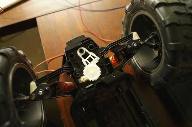 Recomiendo no consigue el mismo carro del RC! Sólo conseguí b y c en el momento, no sé mejor. El problema con este juguete se ilustra en el cierre para arriba del mecanismo de dirección. Que el eje del engranaje pequeño no es impulsado por un servo - es un motor convencional, que hace girar hasta que esté atascado en los extremos del recorrido. Las ruedas se enderezó cuando se quita la energía por un pequeño resorte en el otro lado. Esto significa que hay solamente un ángulo en el que se pueden girar las ruedas, y el ángulo es demasiado pequeño para hacer agudo gira a baja velocidad.