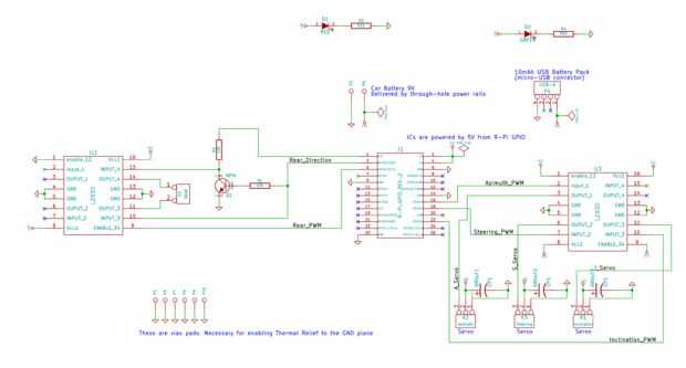 Esta sección describe el circuito de control utilizado para impulsión servos y el motor trasero del puerto GPIO de RPi.
