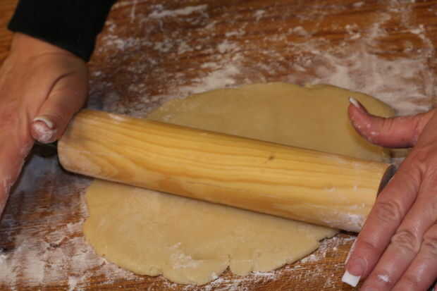 8. con un rodillo, continuar rodando la masa refrigerada hasta que quede 1/8 de pulgada de grosor (y vuelta)