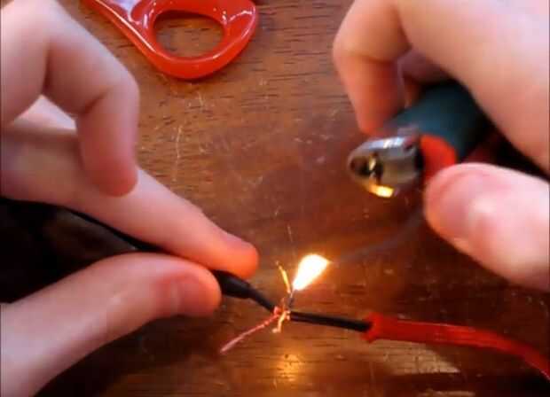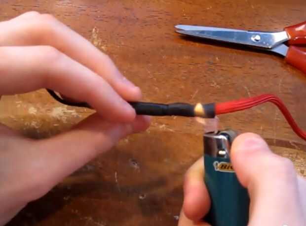 Después de pelar el cable de auriculares, verá 2 hilos envuelto en fibra de algodón de colores. Para volver a colocar los cables juntos, usted primero debe físicamente trence los cables: y luego quemar la fibra de algodón con un encendedor:
