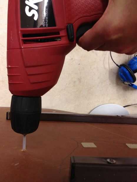 Perfore un agujero a cada lado de la caja que usted dibujó.  Los agujeros deben ser aproximadamente 3 pulgadas de la caja que usted dibujó.  Estos agujeros mantendrán los tornillos que sujetan la caja de conexiones en su lugar debajo de la mesa.