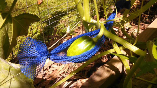 - Calabaza, pepinos o calabazas deben sembrarse en el mismo patrón como tomates, pero en lugar de solo plantas, planta grupos de 3 o 4 plantas. cada cluster o "colina" debe ser aproximadamente 2 pies de separación. Pepinos pueden ser un poco más cercanos juntos, cerca de 1 pie de distancia. Vides de squash tienen zarcillos que se envuelven alrededor de la guita pero todavía pueden necesitar atar. Estos zarcillos no son lo suficientemente fuertes como para soportar una planta completamente crecida con calabazas, por lo que vas a tener que atar la vid a la guita. Squash fruta se puede apoyar con pequeños "hamacas" de tela o malla. Me gusta usar pantimedias o la malla de malla barato bolsos del lavadero. Asegúrese de que es algo que se seca rápidamente y es transpirable.