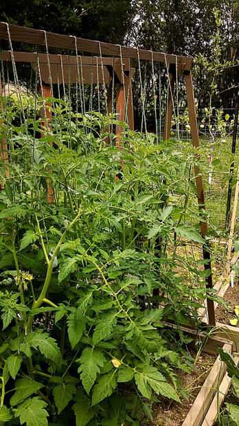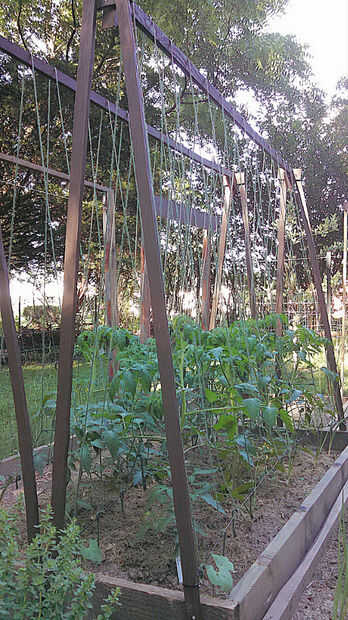 - Tomates deben colocarse en una fila entre los cables de la parte inferior, cerca de 2 pies entre plantas. Plantas de tomate tendrá que ser podadas a 4 cepas principales. Seleccione dos ramas de la planta joven y atar a la cuerda. Dejó ésos cada crece y en unas semanas seleccionar dos ramas de cada una. Repita hasta que cada hilo tiene una vid que se adjunta. atar las vides a la rejilla que cada pie o utilizando tiras de tela o medias (guita de cavar en las viñas y lesionarlos). No dejes que las vides de inclinación o colgar hacia abajo o se podría romper. Pizca de ramas laterales o "tontos" que crecen entre las hojas y la vid.