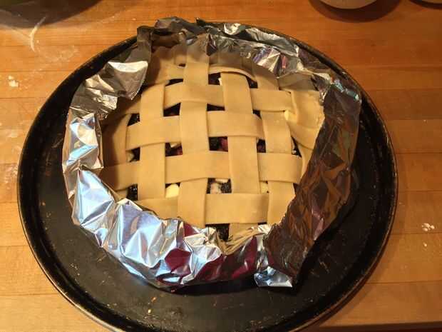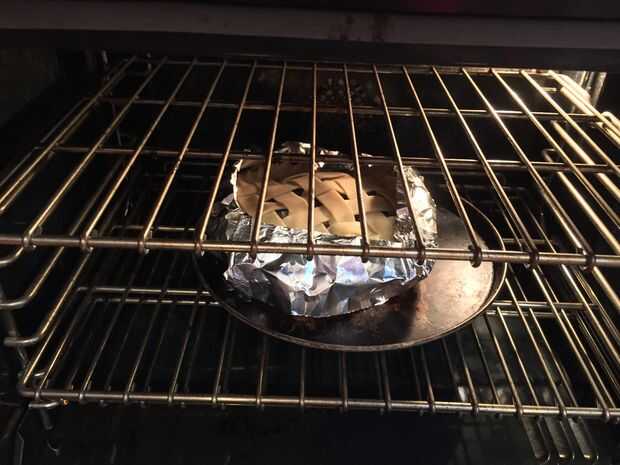 Mi receta para poner el pie en una hoja las poco profunda para atrapar gotas y para cubrir el borde de la tarta con una tira de papel de hasta unos 15-20 minutos antes de hacerlo. Esto impide que quemarse. Ambos son vale la pena hacer, en mi opinión.
