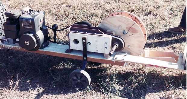 Nota atadura termina conectado listo para enrollar. Carrete desliza sobre uno de los extremos del eje de las púas de la transmisión de un roto-tiller difunto. Motor, ruedas y sus puntales y recogida de polea y la palanca vinieron de roto-tiller, todos fueron montados en un tablero para hacer el trailer. El carrete obtiene rotación lenta en el alto esfuerzo de torsión. Tres pernos y tuercas de mariposa fije una estrecha pieza de madera contrachapada para la parte trasera del remolque que tiene un pie que soporta el conjunto de zapatos de la guía y la tensión.