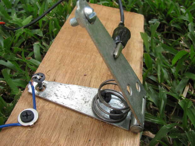 El pedal funciona muy bien. Es un simple interruptor de contacto compuesto por una bisagra y un muelle. Puedes ver como lo hice en las fotos. El voltaje negativo de la batería va directamente encendido a la bisagra. La bisagra entonces hace contacto, cuando está presionado hacia abajo, en un tornillo de madera. El interruptor de pie es montado en otro pedazo de madera.