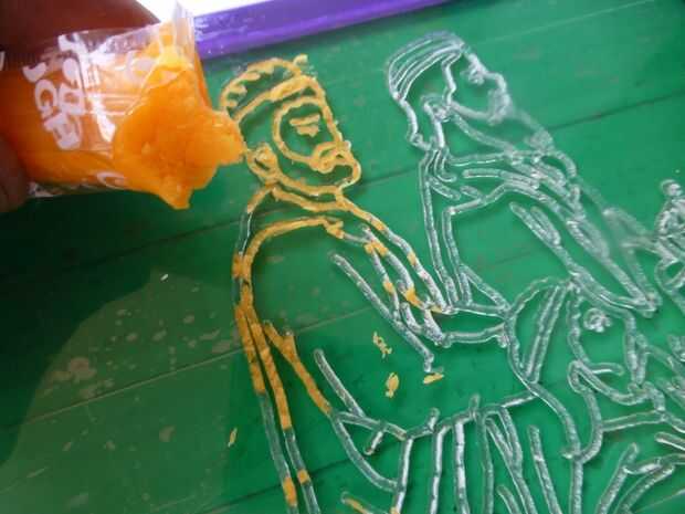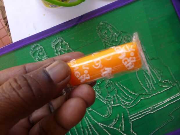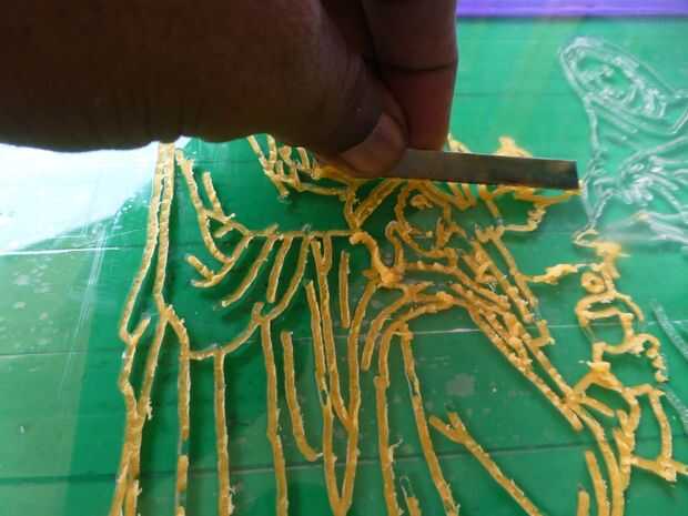 • Si se mantiene la pieza enrutada como es, las líneas enrutadas llano pueden no ser visibles desde una distancia. Así que vamos a utilizar plastilina para rellenar las líneas enrutadas. He seleccionado plastilina color naranja que resaltará la imagen de fondo verde.