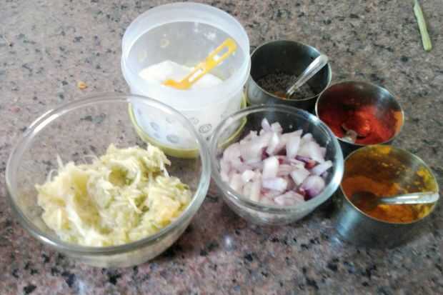 Paso 1: Hacer una combinación picante de mango crudo, cebolla y pimiento rojo
