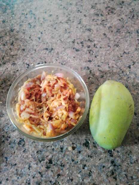 1. Corte el mango crudo en trozos grandes alrededor de la semilla por lo que es fácil de rallar la pulpa. Ahora rallar la pulpa y la transferencia en un recipiente de vidrio.